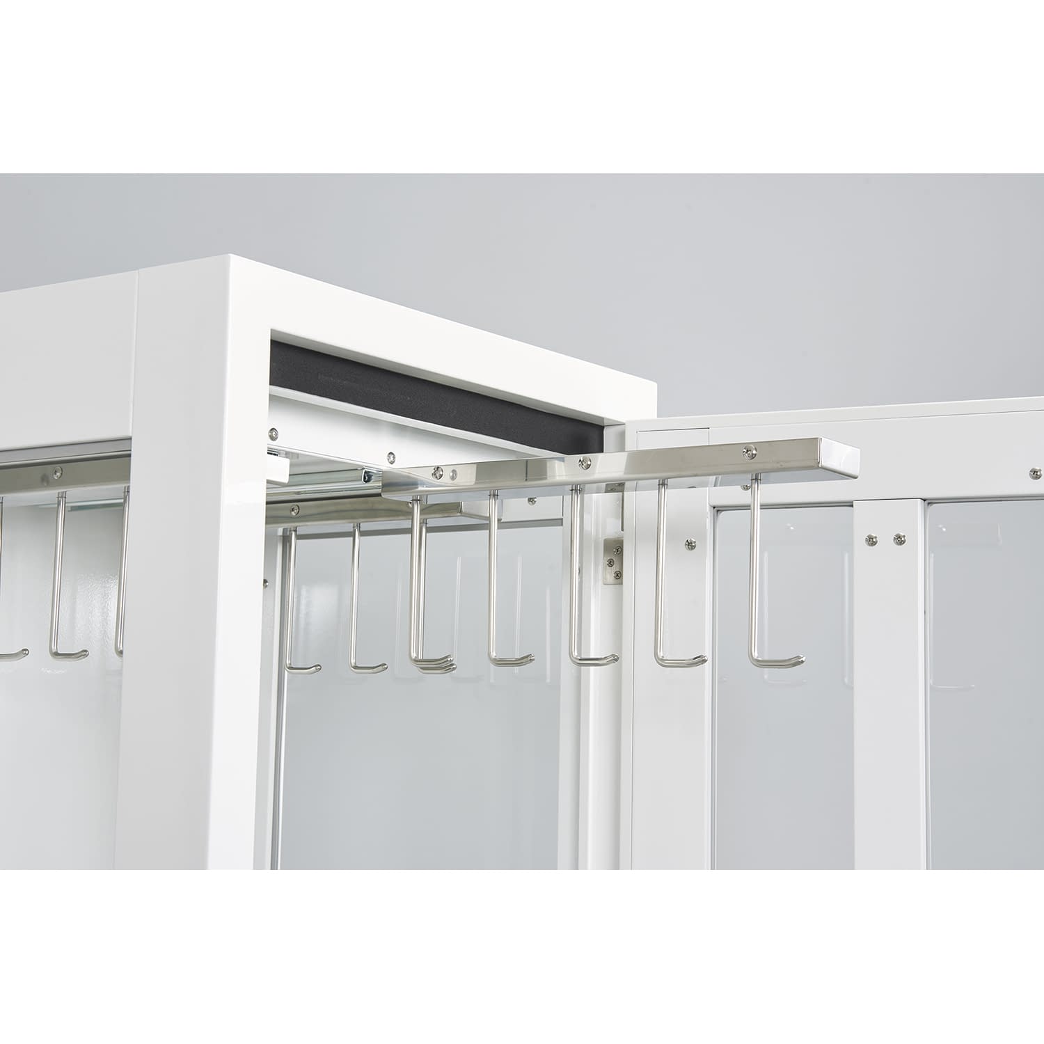 ?奥のカテーテルも取り出しやすいスライド式ハンガーを採用しています。?扉と側面がガラス張りなので中身が見えやすい仕様です。?鍵付きなので保管も安全におこなえます。